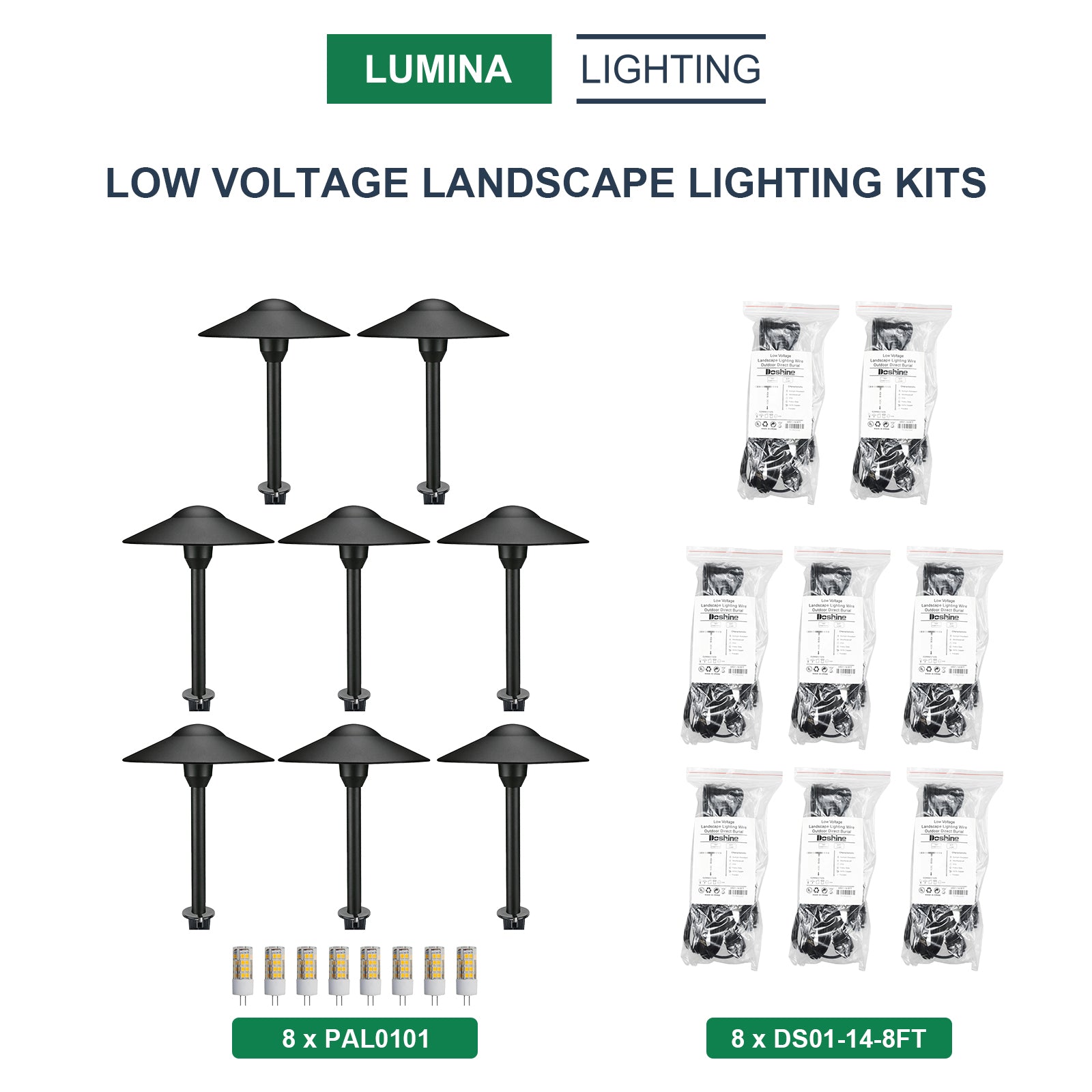 Complete Kit Includes: 8PCS G4 LED Aluminium Pagoda Path Lights, 3000K LED G4 Bi-Pin Bulbs (Path Light), 8PCS 8FT 14-2 direct burial cables with Water-Resistant easy connectors.